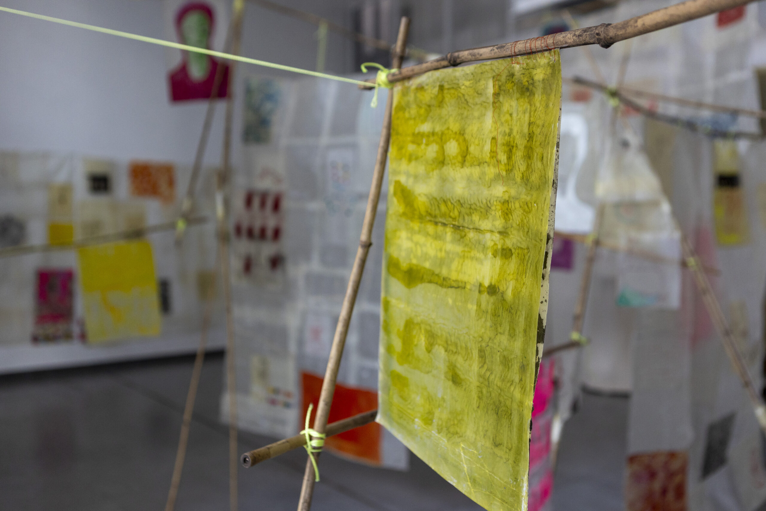 Katharina Lökenhoff ’s artistic work is guided by the concept of the membranous. The interface that remains passable and, as a resonating place, leaves room for movement and encounter. Like the skin, it forms a common level of contact between the world and the body, remaining flexible and mobile in its tiligree structure, but also vulnerable. In the membrane works by Katharina Lökenhoff, this becomes effective both formally in the creative means as well as in terms of motif and aesthetics: evident in the supple material of the wax skin, with which the canvas or painting surface becomes a permeable fabric – with iridescent surfaces that range from a delicate, shiny to a matt, opaque appearance. The silk dipped in wax testities to a lightness and transparency that both conceals and reveals. lt is a tactile art in which the skin is not an object of voyeurism, but becomes a feeling subject. In the series of typological portraits, this is expressed in the changing membrane skins, through which certain states of consciousness appear in the face. Seeing as touching, in which the eye (of the artist) can sometimes lose its distance and lead to an encounter with itself. The material image carrier literally becomes a membrane where opposing movements intersect. The composition and format of the portraits themselves also create moments of contact, in which the visual axes penetrate each other and lead us into our own inner selves. Driven by a permeability that dissolves hierarchies and questions positionings and orientations, Lökenhoff’s works approach threshold situations and moments that repeatedly elude strict binarities.