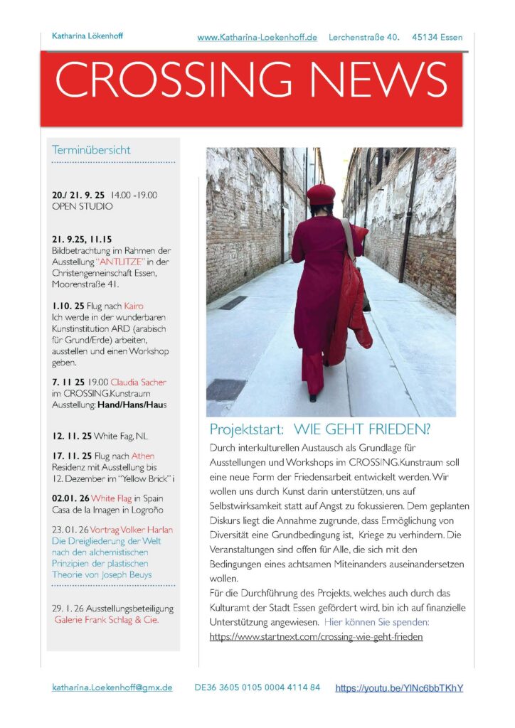 Im Jahr 2018/2019 war Katharina Lökenhoff mit ihrem künstlerischen Forschungsprojekt CROSSING THE THRESHOLD auf Reisen von Island nach Südafrika und befragte weltweit Künstler:innen zu diesem Thema. Aus diesem Prozess entwickelte sie den neuen interdisziplinären Projektraum CROSSING, der seit 2024 in Essen angesiedelt ist. Im Jahr 2025/26 wird es weitere Reisen geben. In Interviews und Ausstellungen wird die Konfrontation mit Schwellenphänomenen als Grundlage nachhaltiger Zukunftsgestaltung weitergeführt und die Ergebnisse u.A. im Kunstraum CROSSING gezeigt werden.